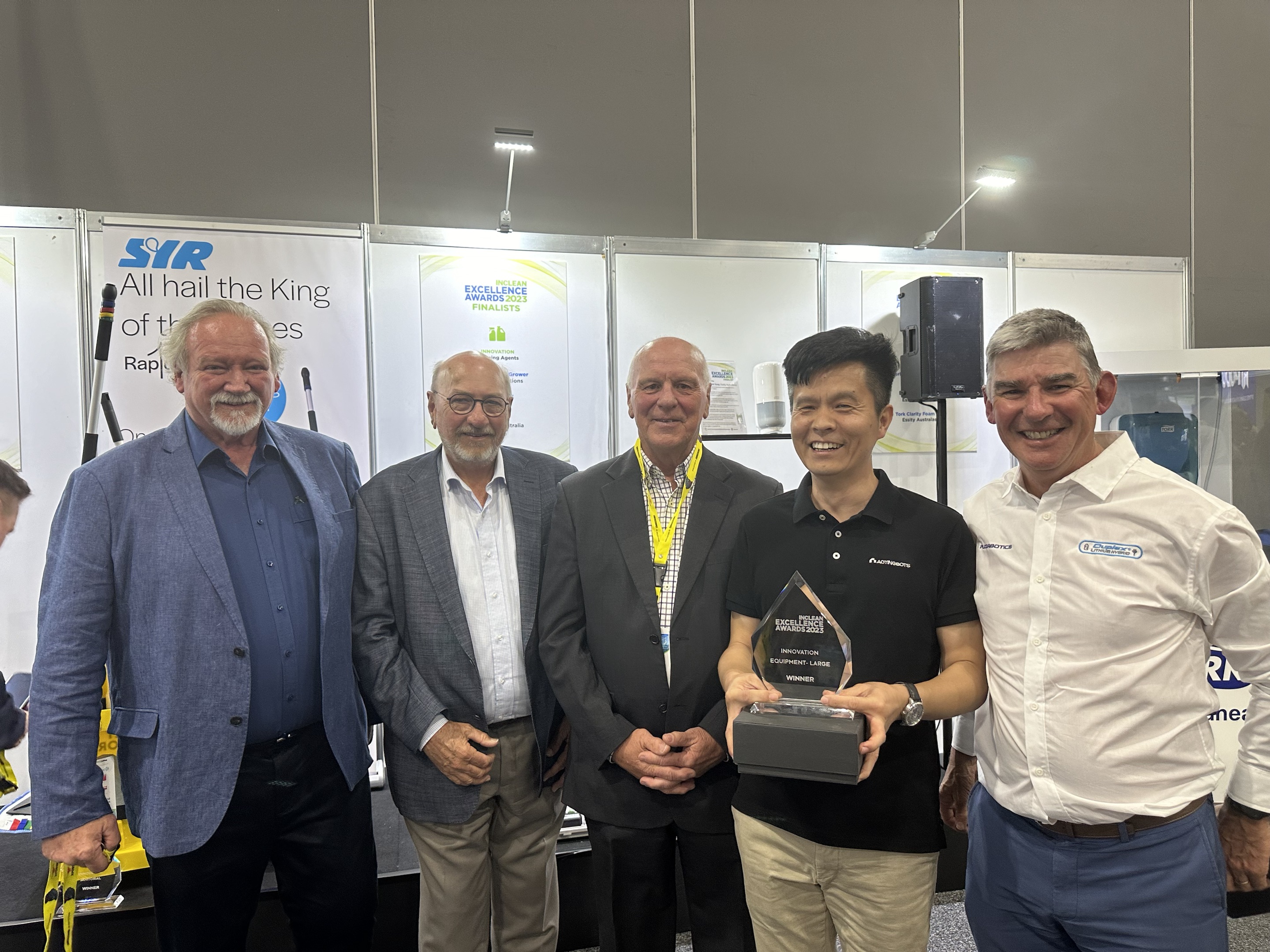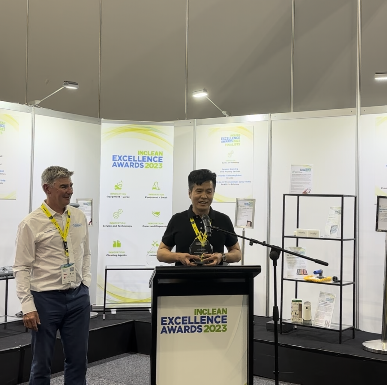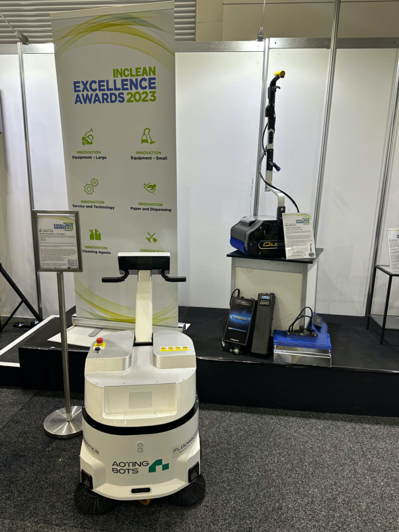 哈工澳汀商用无水清洁机器人与国际清洁巨头Tennant、新加坡机器人创新代表Lionsbot一同角逐2023年INCLEAN创新卓越奖,最终哈工澳汀荣获INCLEAN创新卓越奖(large设备类唯一奖项)。