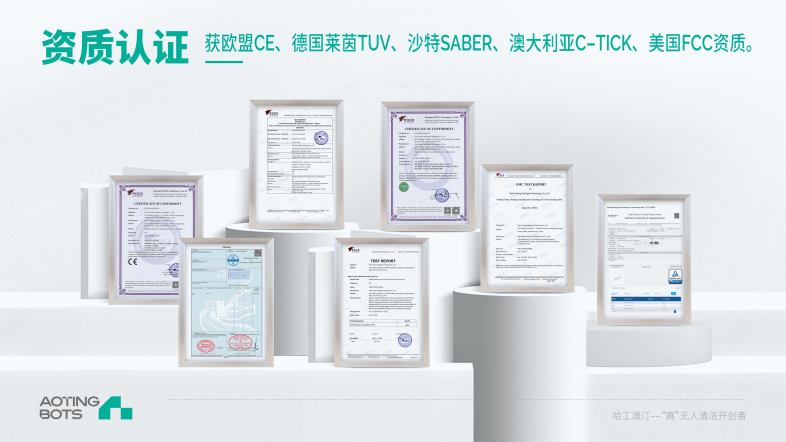 澳汀商用无水清洁机器人已具备海外出口资质,顺利通过欧盟CE、德国TUV、澳大利亚C-TICK、美国FCC、沙特SABER等相关认证,特别是其中安规认证部分,标志着符合欧盟市场相关产品的安全规范。